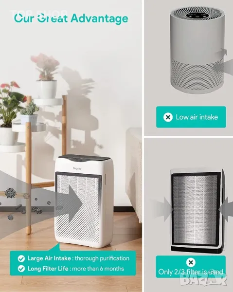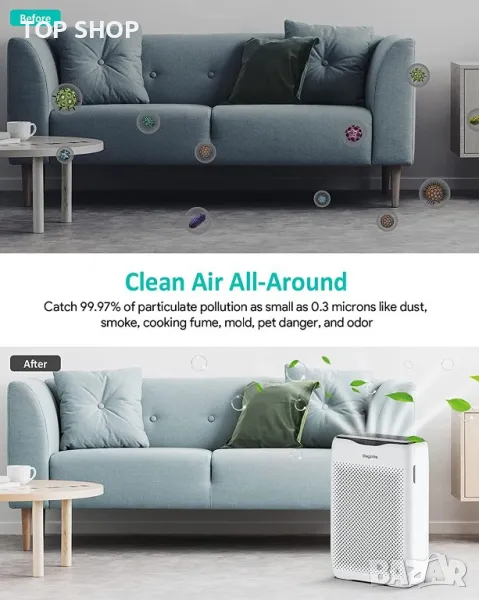 Филтър 3 в 1: предфилтър, HEPA филтър, филтър с активен въглен. Пречиствателят на въздух не само премахва частици като прах, цветен прашец, но също така премахва миризмата на домашни любимци и миризмите, оставени при готвене или пушене. Той може ефективно да помогне за подобряване на качеството на въздуха.