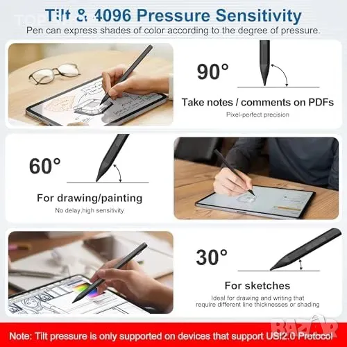 4096 нива на чувствителност към натиск: Прецизни линии с различна дебелина и наклон за естествено рисуване и писане.