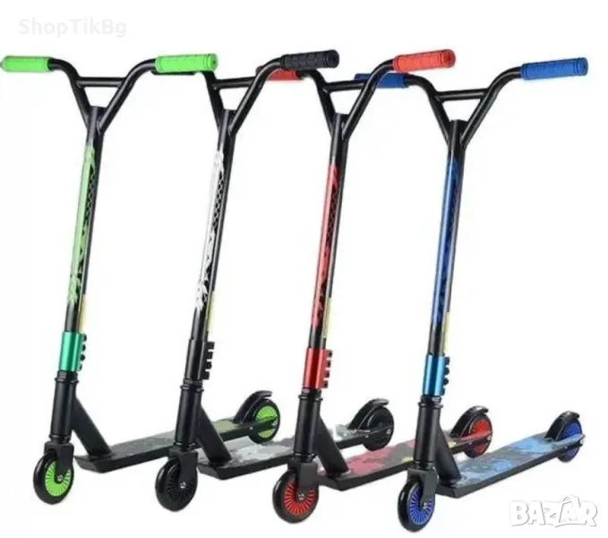 Тротинетка за трикове с метална спирачка и гумени ръкохватки.