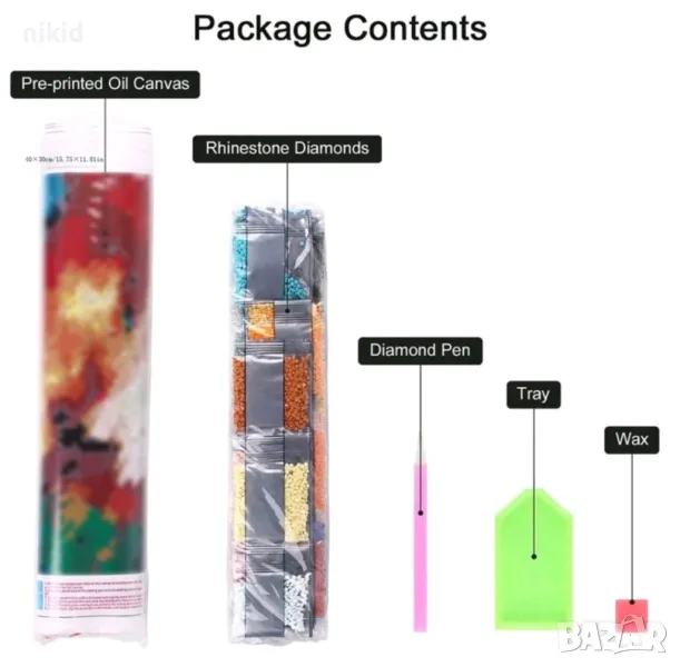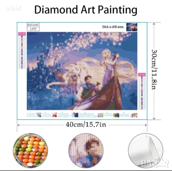 + купичка за мъниста и картина с фолио,която има готово нанесен слой лепило и по дадените цветове се залепват камъчета,много лесно,приятно и отморяващо,подходящо дори и за деца, не изисква особена сръчност и умения