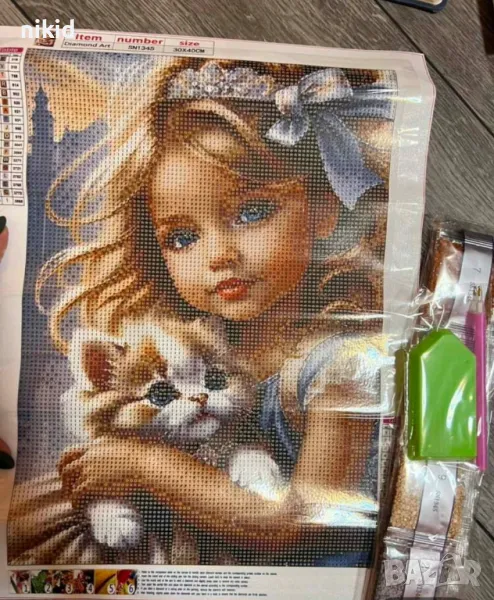 + купичка за мъниста и картина с фолио,която има готово нанесен слой лепило и по дадените цветове се залепват камъчета,много лесно,приятно и отморяващо,подходящо дори и за деца, не изисква особена сръчност и умения