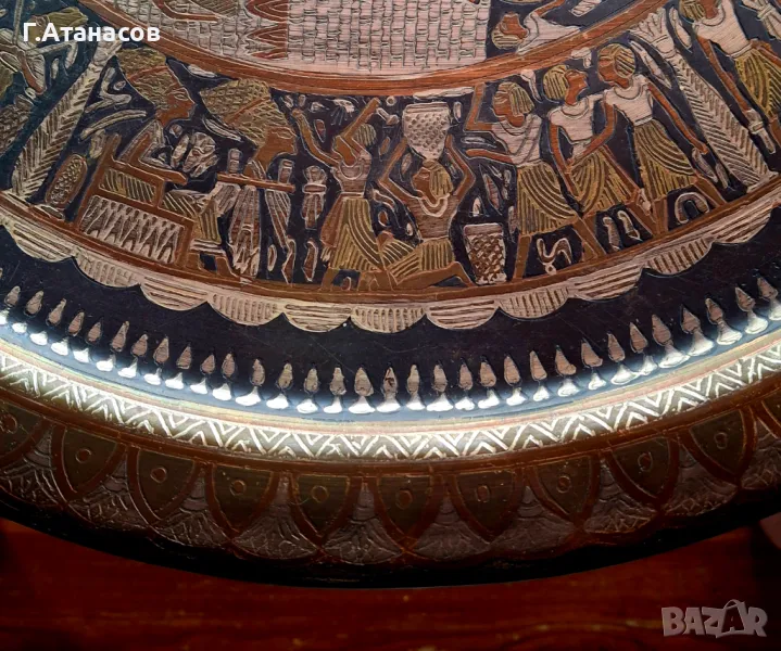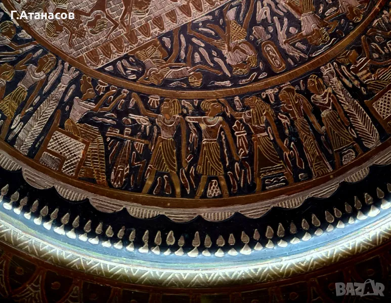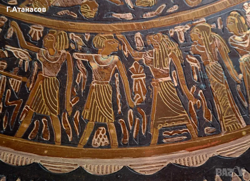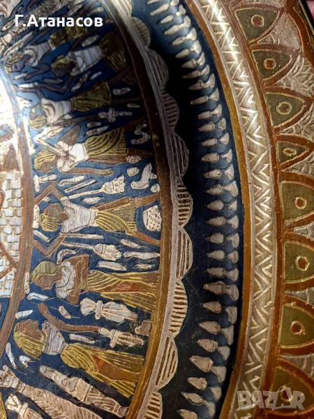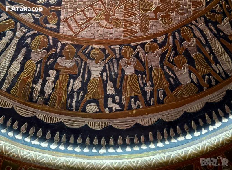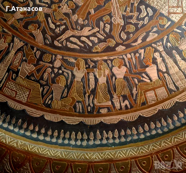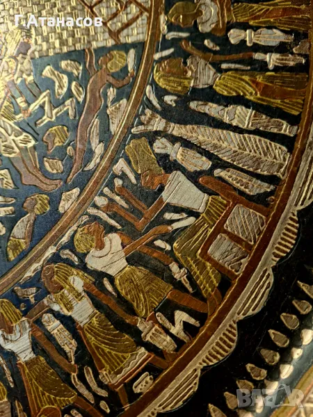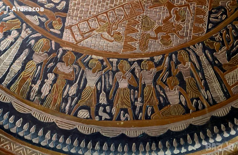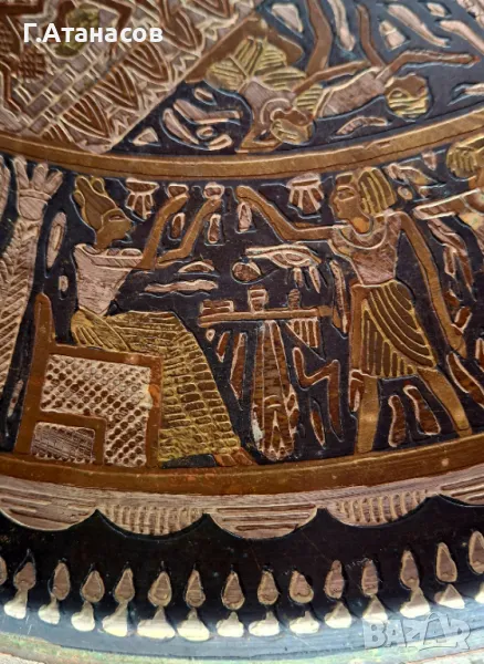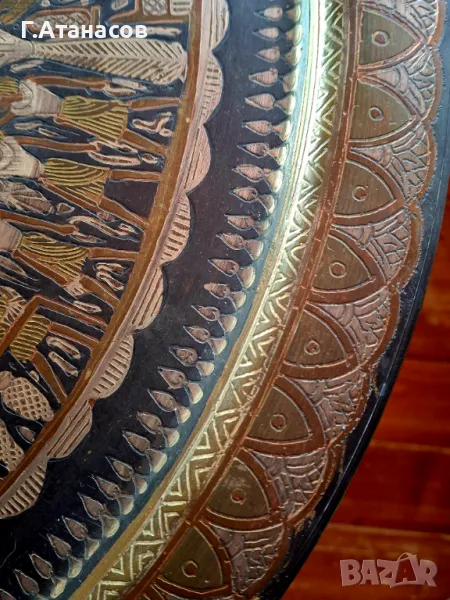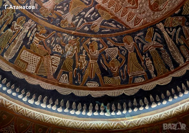 Старинен египетски меден поднос гравиран със сребърни и златни орнаменти → Обява 49296049