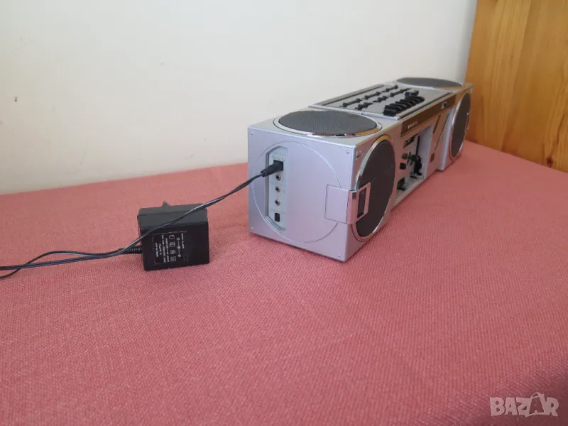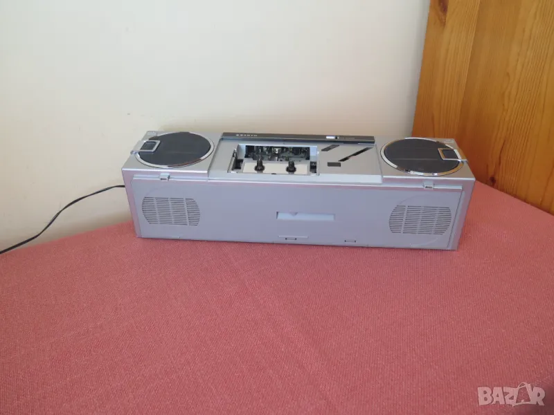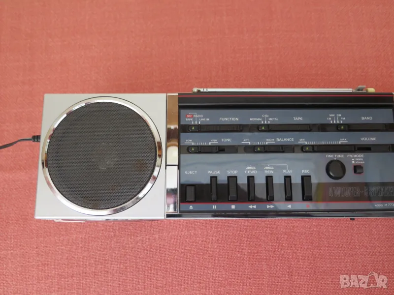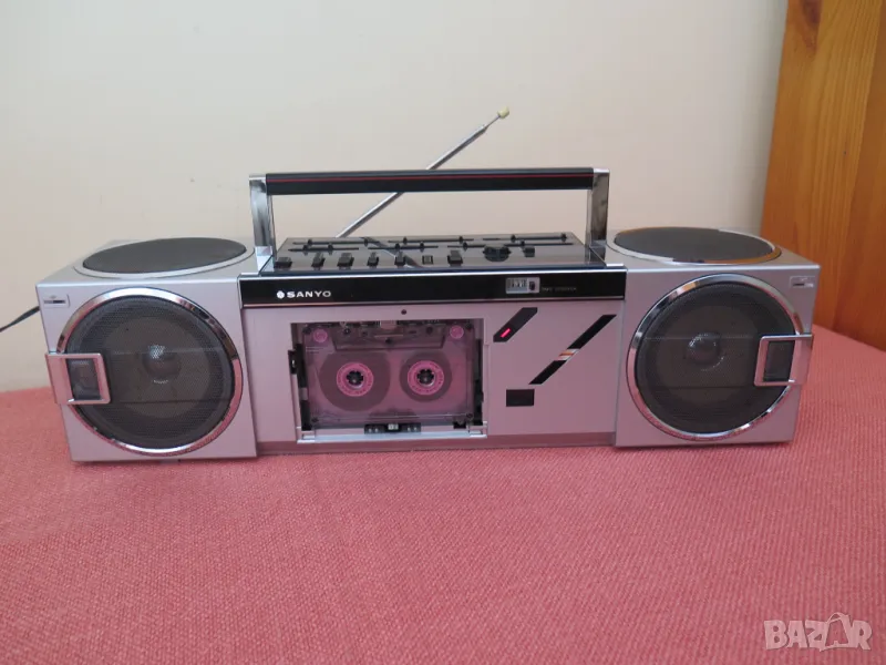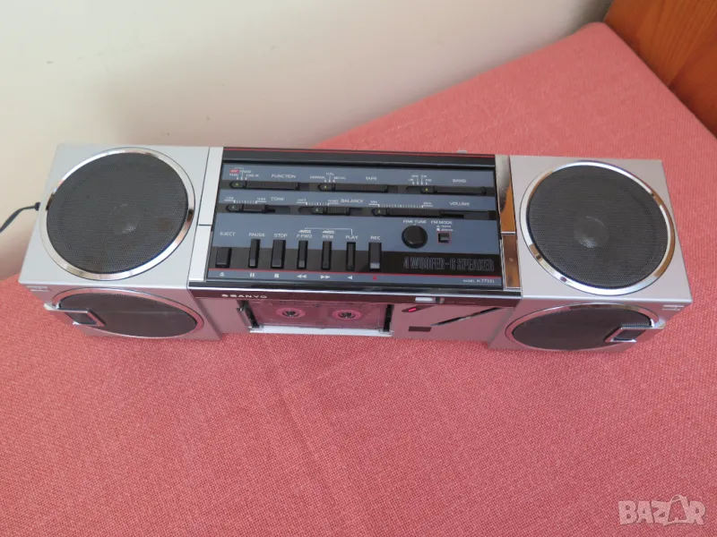 Vintage Sanyo Cubic Stereo M-7735 1985 Japan Boombox Radio Tape Recorder Player. Работи радиото и касетната част.AMSS - не се включва има проблем,нито превъртане назад,нито напред.Липсва капака на касетата.При въртене на потенц. на звука има пръщене.Цената е крайна.