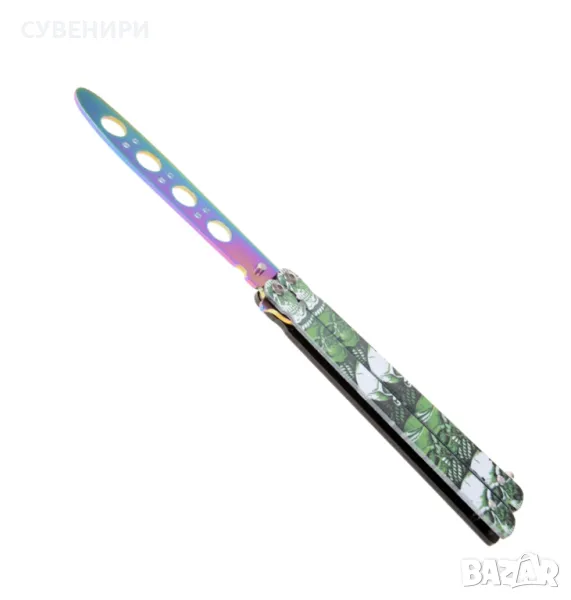 Джобен сгъваем нож - тип пеперуда с острие на дупки в хамелеонов цвят. Дръжките са декорирани с принт на черепи в бял и зелен цвят.