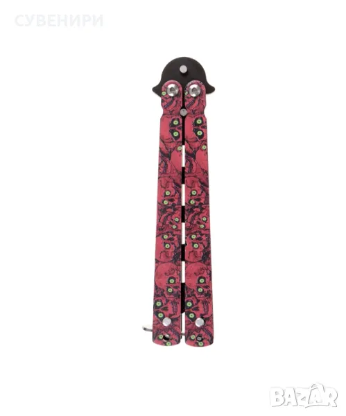 Джобен сгъваем нож - тип пеперуда с острие на дупки в черен цвят. Дръжките са в черен цвят и декорирани с принт на червени черепи със зелени очи.