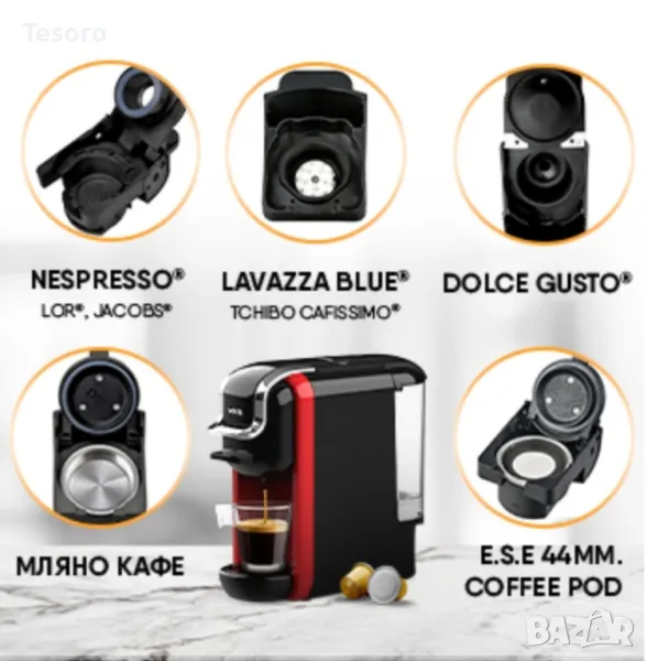 Кафемашина 8-в-1Прозрачен, изваждащ се резервоар за вода Помпа с 19 бара налягане Главен бутон ON/OFF (ВКЛЮЧЕНО/ИЗКЛЮЧЕНО) Избор на късо или дълго Еспресо Индикация с различна системаВъзможност за ръчно или автоматично спиране Режим на готовност след 15 минутиСъс система за варене с нагревателен елемент С 5 различни адаптера: Долче густо (Dolce gusto) - съвместима с капсули Dolce gustoНеспресо (Nespresso)- съвместима с капсули Nespresso; L'OR; Jacobs small capsulesЛаваца (LAVAZZA BLUE)- съвместима с капсули LAVAZZA BLUE; Tchibo CafissimoESE 44mm Coffee podЦедка за мляно кафе Захранване: 220-240V~, 50/60Hz, 1650W;Гаранция: 24 месецаМога да направя лек коментар на цената.