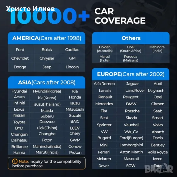 Широка съвместимост: Това диагностично устройство OBD2 е подходящо за повечето базирани в САЩ автомобили от 1996 г., автомобили в ЕС от 2000 г. и азиатски автомобили от 2008 г. Продуктът поддържа 10 езика, което гарантира практично използване. AutoVIN и Autoscan: Този диагностичен скенер бързо се свързва с модулите на контролния блок на превозното средство във всички налични бордови системи и извършва автоматично сканиране, за да локализира неизправностите и да получи съответните DTC.
