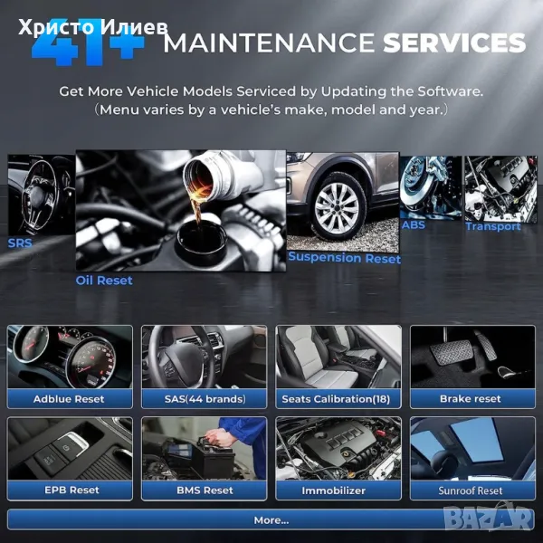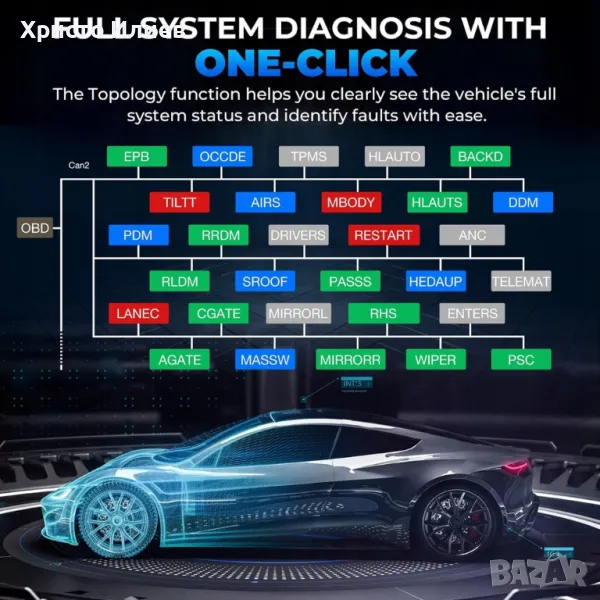 Осигурява цялостен достъп и умения за активно тестване. Показване на топологична карта: Топологичното картографиране визуализира всички основни автомобилни системи в дърво на диаграма и проверява всички състояния на системата с едно щракване. 41+ услуги по поддръжка: Инструментът може да извършва широк набор от услуги по поддръжка, включително нулиране на маслото, сензор за ъгъл на завиване, система за следене на налягането в гумите, регенериране на филтър за твърди частици, IMMO кодиране и др. Осигурява планирани работи и дори работен процес за улесняване на поддръжката в гаража или работилницата.