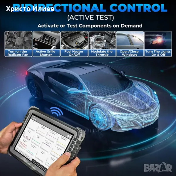 Двупосочна проверка: Този инструмент за сканиране позволява различни двупосочни тестове, като деактивиране на круиз контрола за регулиране на разстоянието, периодично подаване на горивна помпа, извършване на A/C тестове и др. Той може също да извършва специфични тестове като проверка на налягането на маслото, спирачна смукателна помпа и тестове за впръскване.
