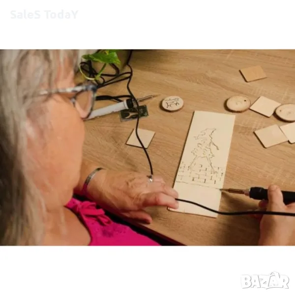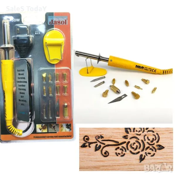 - Пълен комплект: Включва регулируем термопен за пирография, стойка и 12 универсални накрайника, които ви позволяват да експериментирате с различни техники – рисуване, щамповане, запояване и работа с нож.