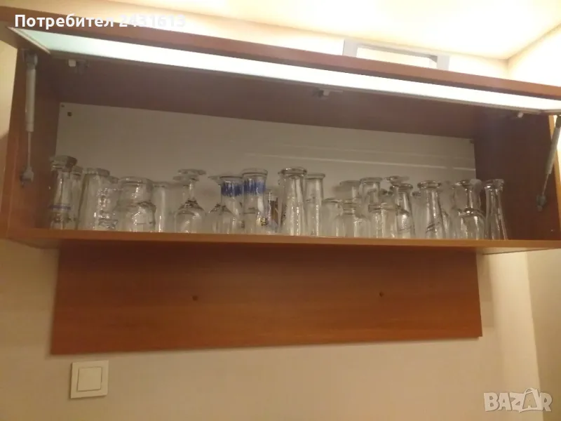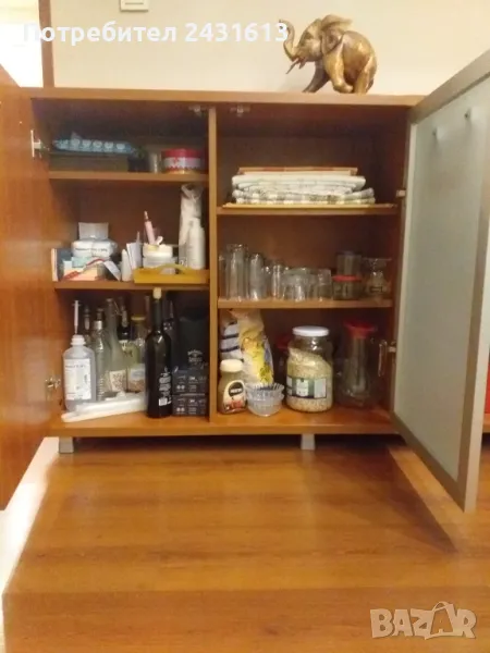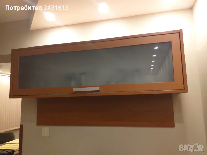 Правени са по поръчка. Регулируеми крачета. ПДЧ цвят череша, дебелина на плоскостите 25мм. и 18мм.Стъклата са мат.Горен гръб-бял фазер, долен гръб-фазер череша.Няма наранено никъде. За град София осигурявам доставка за наша сметка.