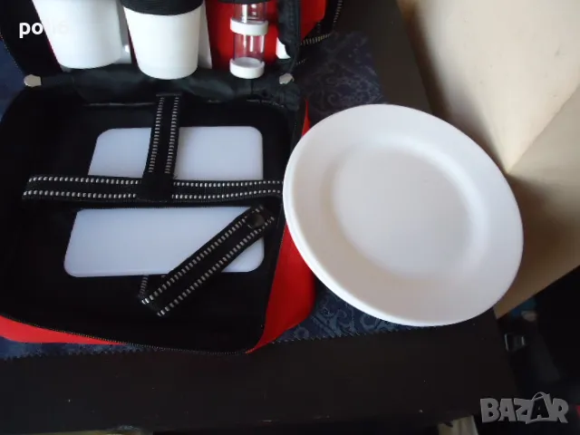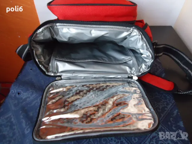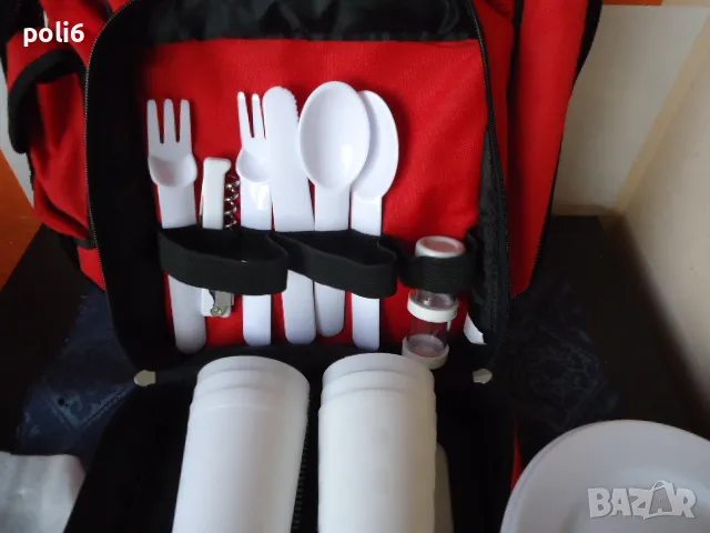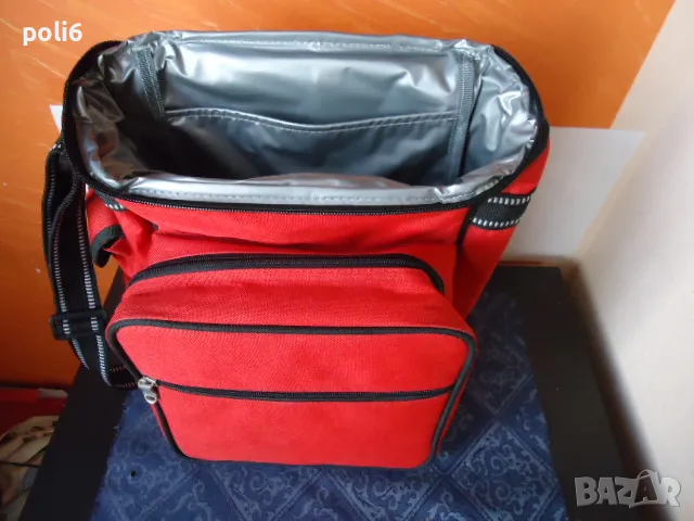 червена хладилна чанта с височина 32см,в предния джоб има - 2 чинии,6 чаши,2вилици,2 лъжици,отварачка - тирбушон ,2 солнички,дъска за рязане ,нож - всичко е от пластмаса,идеална за пренасяне на студени напитки и мезета ///лично предаване в Надежда 2 на Фантастико или метростанция Надежда