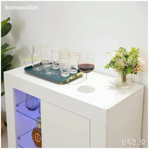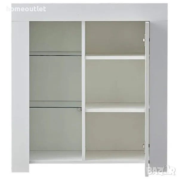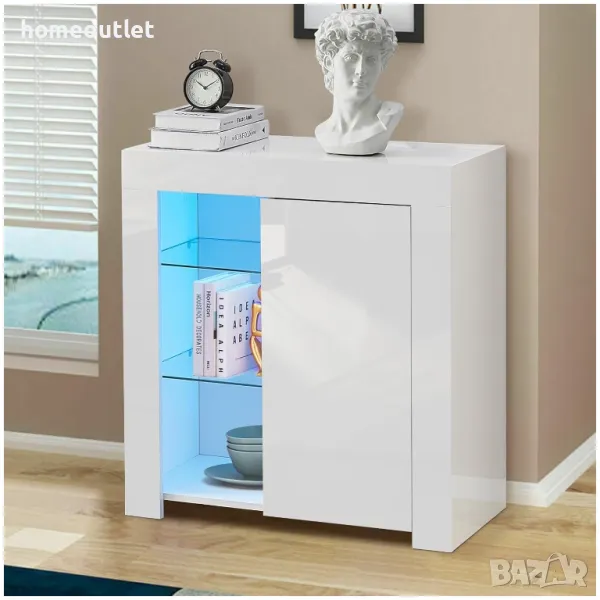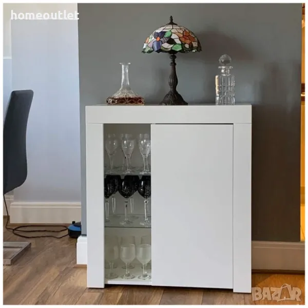 Лицевият панел и вратата на бюфета са с гланцирани повърхности, с ярък блясък. Останалата част от конструкцията е завършена в матово бяло, а едната от вратите е от стъкло.