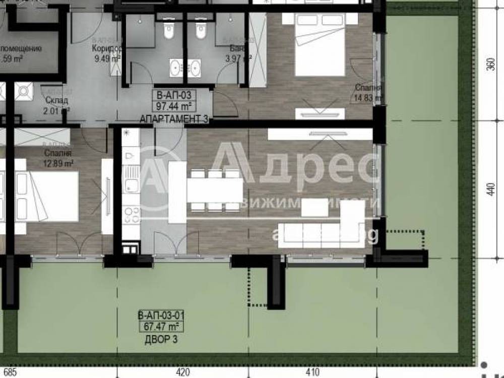 Тристаен апартамент състоящ се от: антре, дневна с кухненски бокс, две спални, баня с тоалетна, тоалетна, склад и прилежащ двор с площ 67,47 кв.м.