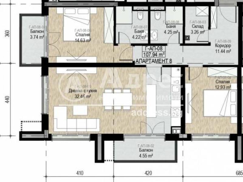 Тристаен апартамент, състоящ се от: коридор, дневна с кухненски бокс, две спални, две бани с тоалетна, склад и две тераси.