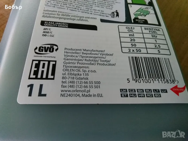 Масло за двутактови двигатели на градинска техника.Производство на рафинерия Орлен-Полша.