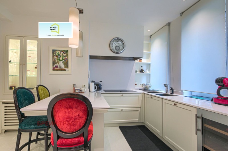 Имотът е обзаведен по дизайнерски проект с проектирана 'smart home' система, разполага с уреди от най-висок клас 'Neff', вграден хладилник за вино, остров от мрамор и кухненски роботи 'Smeg'.