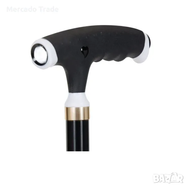 Алуминиев сгъваем бастун с фенерче Mercado Trade с кръгла основа с диаметър 10 см и 4 неплъзгащи се крачета за закрепване на опората. Той се простира от 62 до 97 см на стъпки от 4 см и има добре проектирана дръжка, изработена от неплъзгащ се материал.