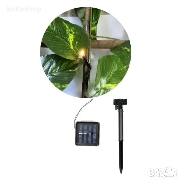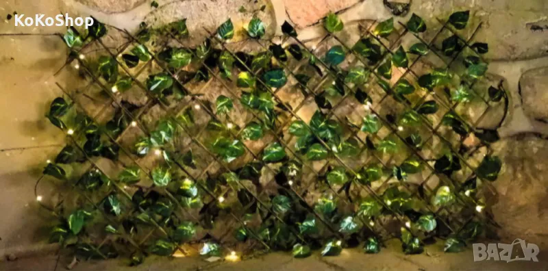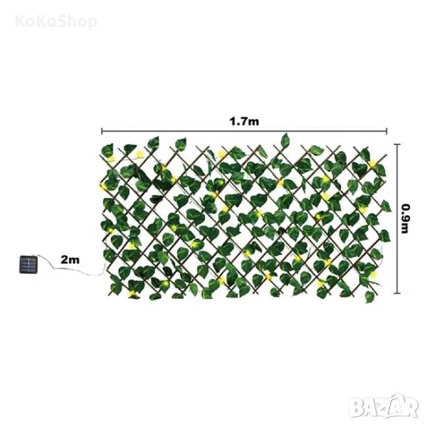 Декоративна дървена,сгъваема пергола,с изкусвени листа и 50 броя соларни LED лампички. Може да бъде поставена вертикално или хоризонтално. Идеална за основа за увивни растения или за разделяне на пространства.