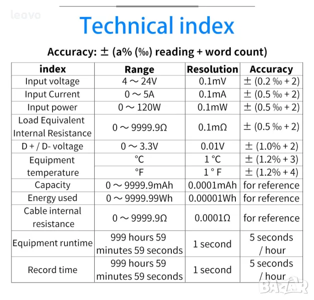 - измерване на капацитет: 0 - 99999 мАч ± 0.0001 мАч