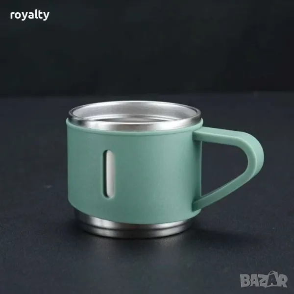 Обем на термоса: 500 ml; Обем на чашите: 150 ml всяка; Материал: Неръждаема стомана; Изолация: Двойна стена; Трайност на изолацията: До 12 часа; Брой части в комплекта: 4 (1 термос и 3 чаши); Цветове: Зелен, розов, сив.