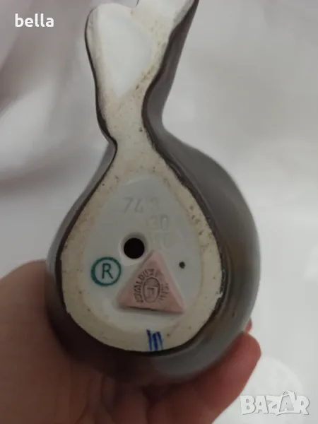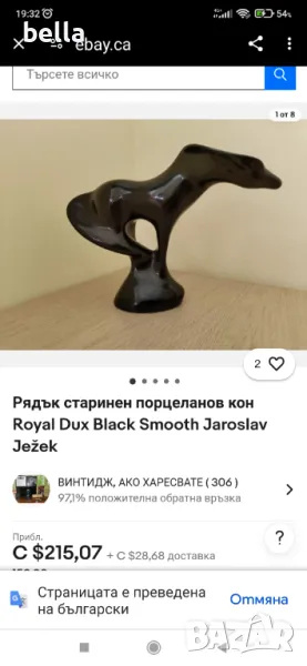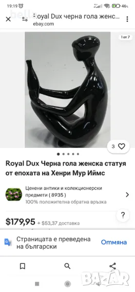порцеланова фигура ,черен порцелан на седяща гола жена от Royal Dux в отличен вид,фигурата е с маркировки и печат в долния край а височината е 16 см. Royal Dux е по-разпространеното име за Duxer Porzellanmanufaktur, която е основана от E. Eichler в Dux, Бохемия през 1860 г. До началото на века фирмата се специализира в порцеланови статуи (черни и бяли) и бюстове на девойки в стил Арт Нуво, големи порцеланови фигури и богато украсени вази с триизмерни фигури, катерещи се отстрани.Цените на фигурите от марката Royal Dux и по точно черният порцелан са много скъпи и трудно намиращи се особено на женски фигури по -лесно може да се намерят серията животни, на последните снимки се виждат примерни две,три фигури на фирмата.Цена 400 лв (цената е твърда и не подлежи на коментар)