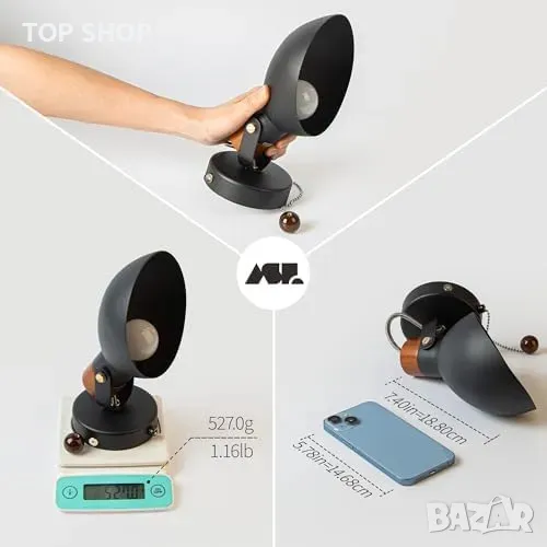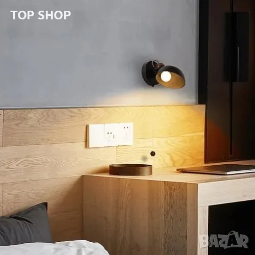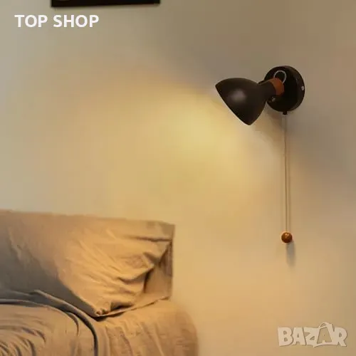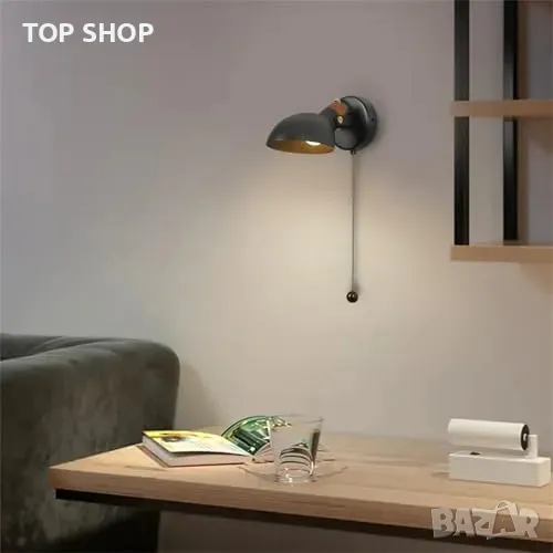 Нова Черна стенна лампа с дървена основа и издърпващ ключ, E14 база