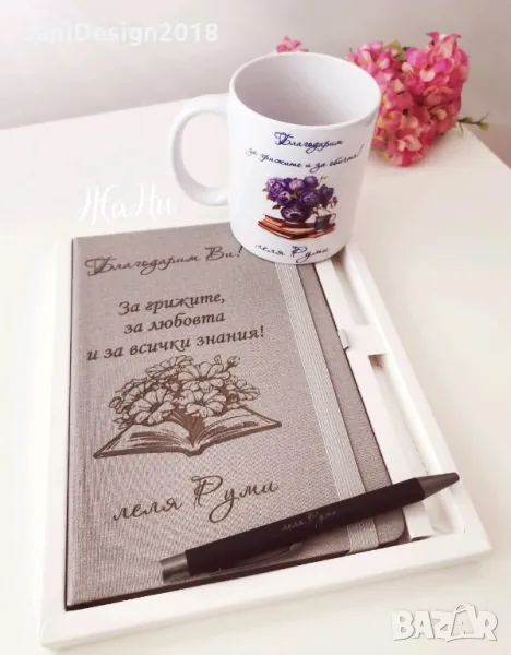 Подаръчен комплект за учител за 8ми Март, празника на буквите, завтршване на учебната, първи учебен денТефтер +химикал в кутия 25лвЧаша 12лвПодаръчна персонална опаковка 5лв