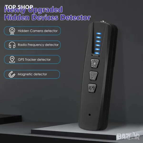 ОПИСАНИЕ - Подобрен антишпионски детектор: С 3-то поколение интелигентен чип, този детектор за скрита камера не само помага да се разшири обхватът на откриване до 100Mhz-8Ghz, но също така подобрява защитата от смущения на продукта. И двата 2G/3G/4G/GSM сигнала могат да бъдат открити бързо и този антишпионски детектор може лесно да открие скрити камери или бъгове около него в околната среда.