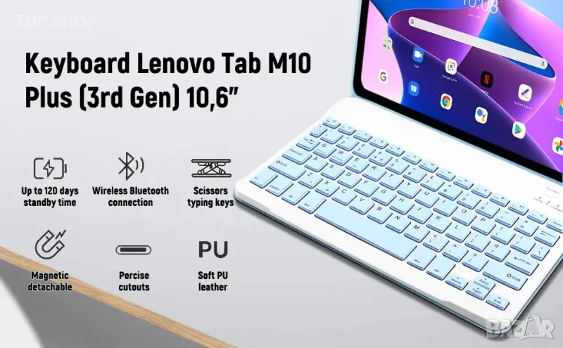 - МАГНЕТИЧНО СВАЛЯМА КЛАВИАТУРА: Клавиатура за Lenovo Tab M10 Plus (3-то поколение) 10,6” с отделен дизайн с флип магнит; Подвижна безжична bluetooth клавиатура с магнитен хибриден калъф, който превръща вашия таблет в лаптоп за по-малко от секунда. Красивите шоколадови клавиши на клавиатурата на Lenovo Tablet M10 Plus (3-то поколение) 10,6 инча (TB-125FU/128FU/128XU) ще ви осигурят гладко и удобно изживяване при писане. Удобен за писане у дома, в офиса или навън.
