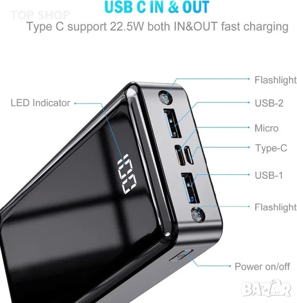 - Интелигентен LED дисплей : PD 22,5 W захранваща банка. Благодарение на ясния цифров дисплей можете лесно да разберете състоянието на батерията на вашето устройство, като натиснете бутона за захранване. Не гадайте повече процента на батериите. Powerbank с LED фенерче е идеален за спешни случаи, ураган, бедствие, оцеляване, на открито, къмпинг, туризъм, разходка с лодка, лов, нощна работа, прекъсване на тока, дома, ежедневна употреба. Продължителното натискане включва или изключва фенерчето.