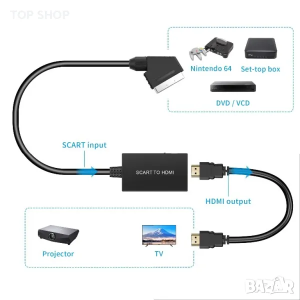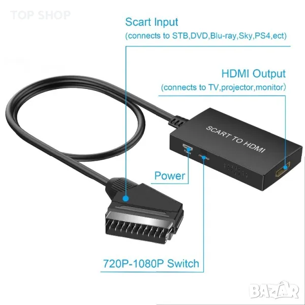Scart към HDMI конвертор: Този Scart HDMI адаптер е универсален конвертор за аналогов входен композитен Scart сигнал и го преобразува в цифров HDMI 720P/1080P изход. За Scart сигнали за възпроизвеждане на HDTV, монитор или проектор с HDMI входове, но без Scart. Не се поддържа HDMI КЪМ SCART!