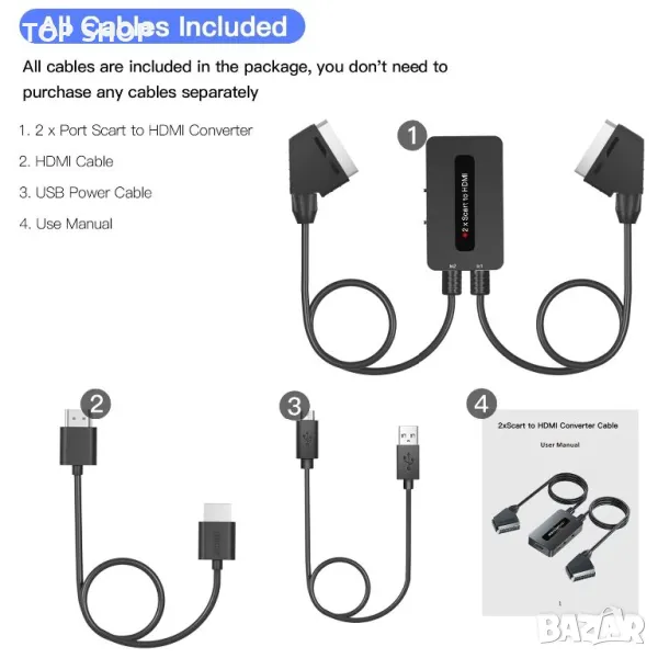Scart към HDMI конвертор: 1 x двупортов Scart към HDMI конвертор; 1 x HDMI кабел; 2 x Scart кабели, 1 x USB захранващ кабел, 1 x ръководство за потребителя.