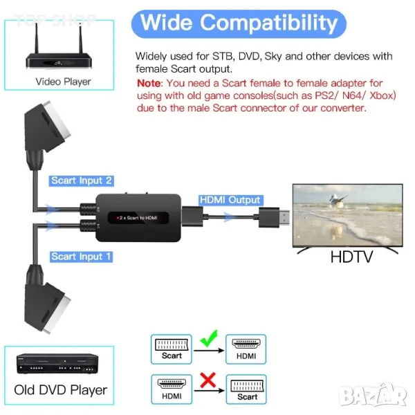 1. Имате нужда от женски към женски Scart адаптер (не е включен), ако използвате със стари игрови конзоли с мъжки Scart (като PS2/N64/Xbox), тъй като Scart конекторът на този конвертор е мъжки.