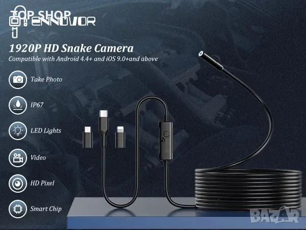 ENNOVOR 5м USB Ендоскоп 1920p HD,iOS/Android/6.9mm/гъвкава твърда змийска камера/IP67/8 LED