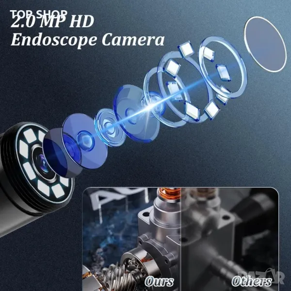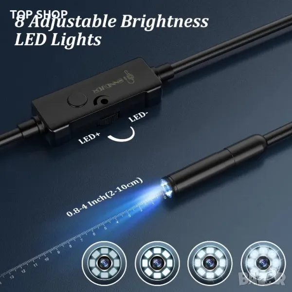 ОПИСАНИЕ - 1920P HD пиксели: Ендоскопската камера има 1920P HD пиксели за представяне на ясни изображения и видеоклипове. 8 регулируеми LED камери осигуряват ясни изображения дори в тъмна среда. Ендоскопът е оборудван със сонда 6,9 mm, която е компактна и преносима.