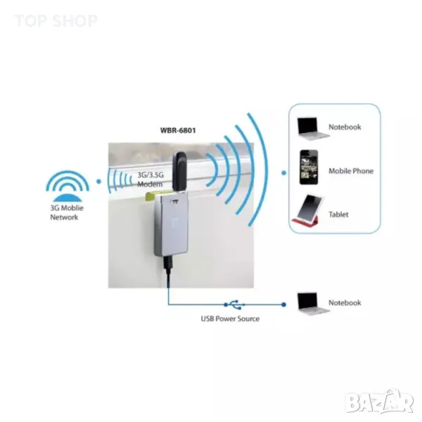 - Двойни опции за захранване - USB порт или захранващ адаптер LevelOne WBR-6801 е истинско преносимо решение за споделяне на вашата 3G интернет връзка, без значение къде се намирате. Просто включете вашия 3G модем в USB порта на WBR-6801 и той ще сподели интернет връзката през безжична LAN мрежа. Той поддържа 3G карти за данни, обхващащи WCDMA (HSUPA), CDMA2000 и TDSCDMA. Не само това, поддържа се и тетеринг на мобилен телефон. Поддържа безжични скорости до 150Mbps, използвайки безжичната технология N на LevelOne, като същевременно поддържа съвместимост с по-стари устройства 801.11g и 11b. За пълна преносимост WBR-6801 може да се използва със захранване от стандартен USB източник, което означава, че може да се захранва по много различни методи. Те включват от преносим компютър, персонален компютър, батерии, автомобили, лодки или друг източник на захранване. WAN интерфейс и стандарти: