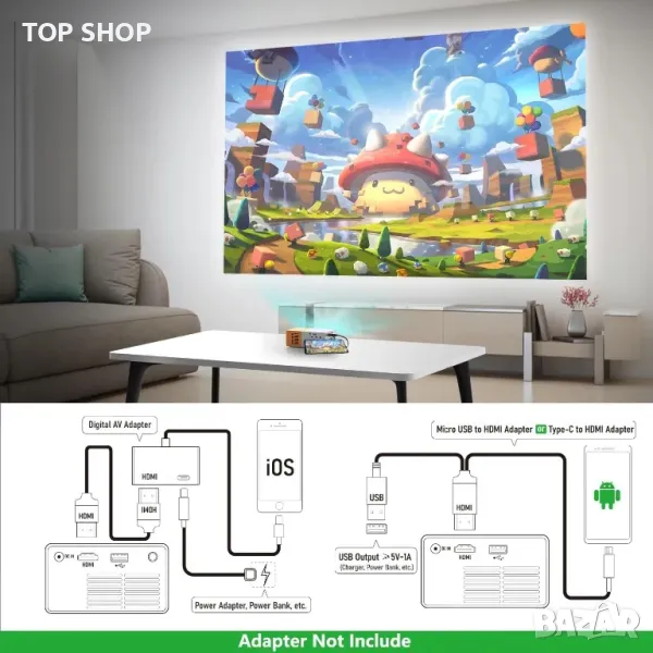 - Захранване на Power Bank: Мини преносимият проектор се захранва от захранващ адаптер (няма вградена батерия), може да се захранва и от зарядно за мобилен телефон, зарядно устройство за кола или захранващ блок чрез микро-USB интерфейс (трябва да поддържа 5V/2.5A), наслаждавайте се по всяко време и навсякъде!
