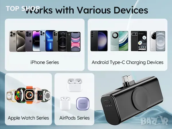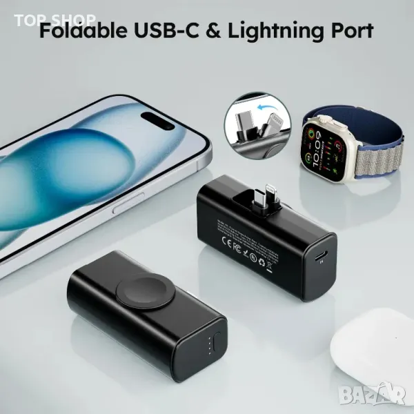 EAZPOWER Мини магнитно зарядно устройство 5000mAh,бързо зареждане/вградени конектори/iPhone/iWatch