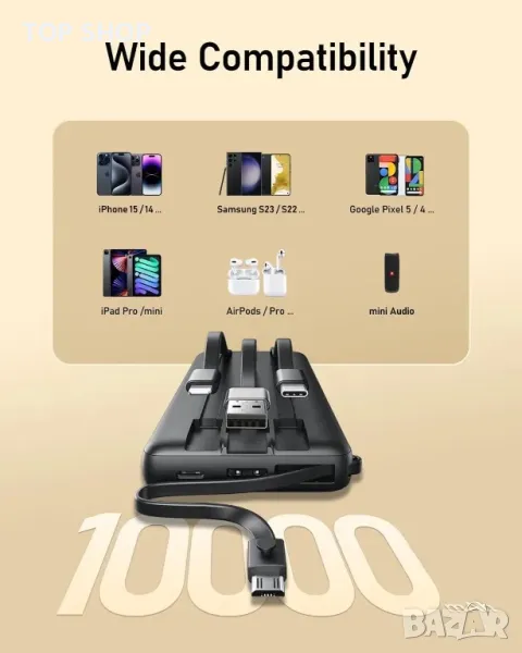 ОПИСАНИЕ - Преносимо зарядно устройство с вградени кабели] Това преносимо зарядно устройство Power Bank разполага с вградени iPhone, USB-C и USB-Micro кабели, което го прави универсално решение. Това преносимо зарядно устройство е универсално съвместимо с популярни смарт устройства, включително iPhone 16/15/14/13/12/11/8/7 серия, XR, XS Max, Samsung Galaxy S24/S23/S22/S21/S10/ S9/S8/Galaxy Z Flip/Z Fold/Galaxy A51/52/53/54/55/Note 20/10, серия Google Pixel и много други смартфони и USB-C устройства