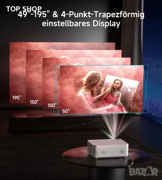 - Голям екран и преносим: Мобилният телефон с проектор ALLJOY може да поддържа размер на проекцията до 195 инча. Освен това има вертикална трапецовидна корекция, която ви позволява свободно да регулирате размера на проекцията и разстоянието според размера на стаята, за да постигнете най-доброто визуално изживяване. Този мини проектор е с размери 21 x 15 x 6,5 см. Той е компактен и лек. Независимо дали сте у дома, на път или на други места, можете да се наслаждавате на филми и игри.