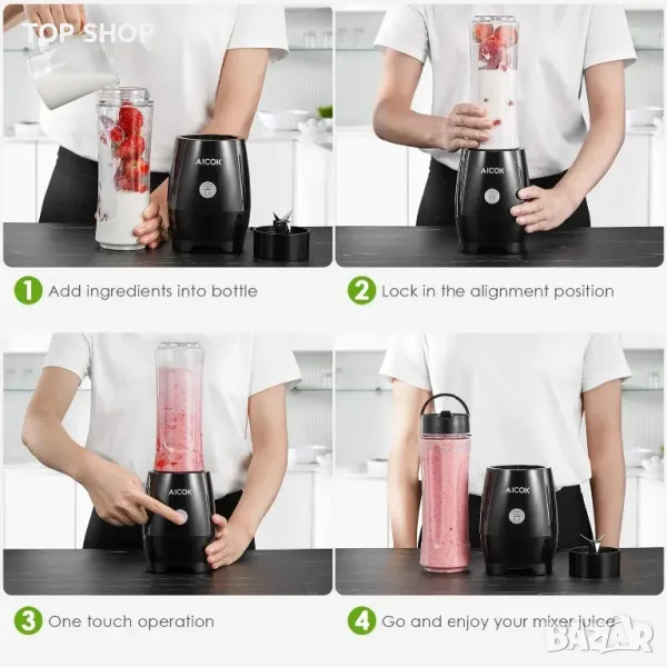 Aicok Смути блендер 300W с 600мл преносима бутилка за пътуване/неръждаема стомана/4 остриета