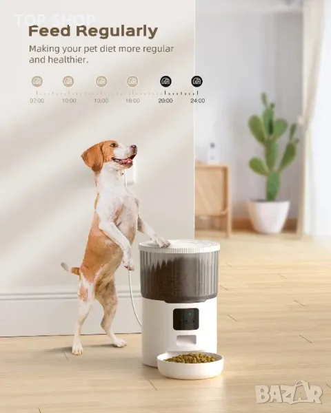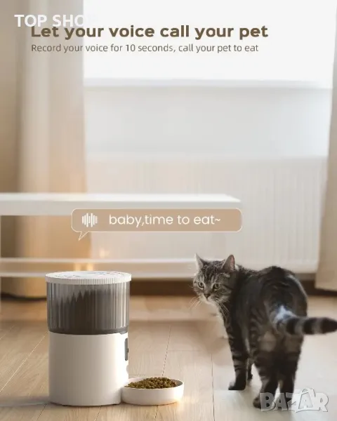 ОПИСАНИЕ - УМНО ПРИЛОЖЕНИЕ И ЗАБАВНО ВЗАИМОДЕЙСТВИЕ Нашият автоматичен дозатор за котешка храна е лесен за настройка и поддържа и двете честоти от 2,4 GHz. Хранете вашия домашен любимец по всяко време и навсякъде чрез приложението. 10-секундният предварително записан глас може да се възпроизвежда по време на хранене. Нека вашият домашен любимец обича гласа ви.
