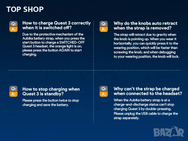 ОПИСАНИЕ * Защо Quest 3S/Quest 3 се нуждаят от бързо зареждане: Тъй като производителността на Quest 3S/Quest 3 е значително подобрена, предишното решение за зареждане, адаптирано за QUEST 2, далеч не е адекватно за нуждите от енергия на Quest 3S/Quest 3. Когато зареждането скоростта не може да съответства на скоростта на консумация на енергия на слушалките Quest 3S/Quest 3, случва се разреждане. В момента повечето ленти за батерии изтощават живота на батерията, но САМО AUBIKA не! Решенията за бързо зареждане спестяват живота на батерията на Quest 3S/Quest 3. Ние вярваме, че това трябва да прави каишката на батерията