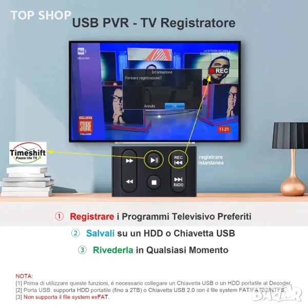 - USB PVR - TV Recorder: Чрез функцията "PVR", присъстваща на декодера, е възможно да записвате любимите си телевизионни програми и да ги запазвате на преносим твърд диск или USB стик, за да ги прегледате по-късно по всяко време. Можете да активирате незабавен запис или да го планирате за определено време (таймер). Поддържа възпроизвеждане на записани файлове на този декодер или компютър