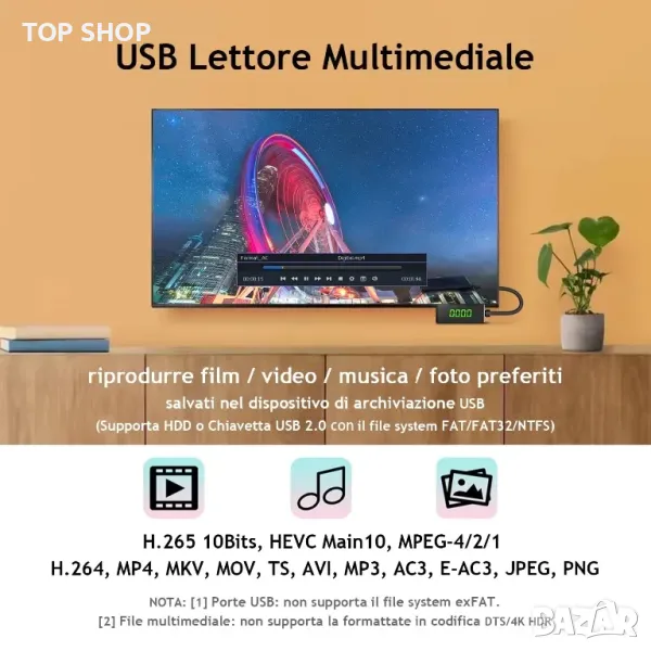 - HEVC USB мултимедиен плейър: Декодерът е оборудван и с мултимедиен плейър, който ви позволява да възпроизвеждате видео/музика/снимки чрез преносим твърд диск или USB стик (HDD/стик не е включен). Поддържа следните формати: HEVC Main10/H.265 10 бита и H.264/MPEG-4 декодиране, MP4, MKV, MOV, TS, AVI, MP3, AC3, EAC3, JPEG, PNG. !! Не поддържа DTS аудио формат