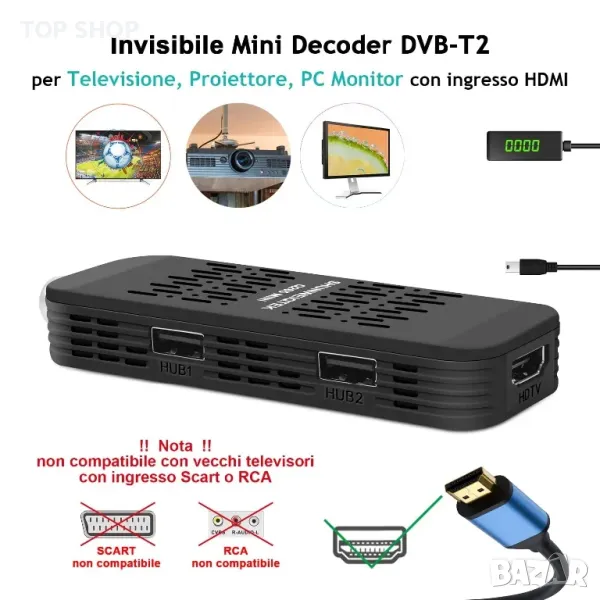 ОПИСАНИЕ - Цифров наземен декодер 2024: Ако имате телевизори, които не са оборудвани с dvb-t2 hevc h265 декодиране, това е икономично решение за преминаване към новия dvb-t2 hevc h.265 телевизионен сигнал. Невидим TV стик за телевизор, проектор и компютърен монитор с HDMI вход (Не е съвместим със стари телевизори със SCART/AV вход). DVB T2 декодерът поддържа HEVC Main10 H.265 10 бита и H.264, MPEG-4/2. Спестете бюджет за закупуване на нови телевизори