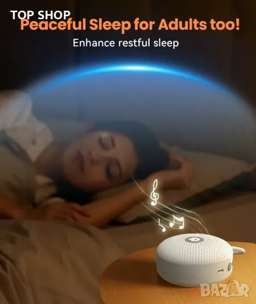 ОПИСАНИЕ - Компактна и мощна- Sleep Lite D11Max е пълен с функции, предназначени да насърчават по-добър сън. С акумулаторна батерия, 21 успокояващи звука, персонализирани таймери, различни нива на звука, заключване за деца за безопасност и функции за памет, тази машина с бял шум е идеална както за деца, така и за възрастни. Това не е просто звукова машина за залъгалка за бебета, а ефективна машина за бял шум за хора, които искат да се отпуснат и да си починат.