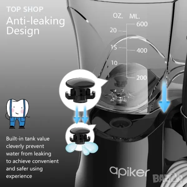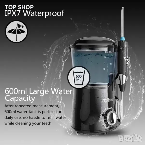 Професионален зъбен душ/воден флосер Apiker за почистване на зъби/резервоар 600мл/8 накрайника