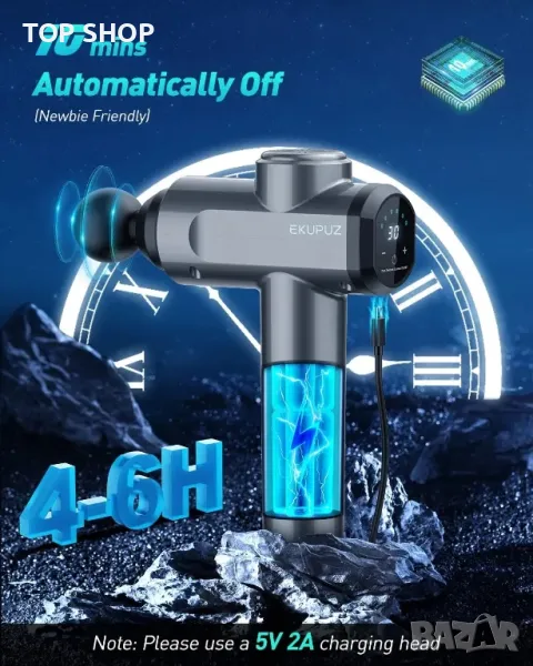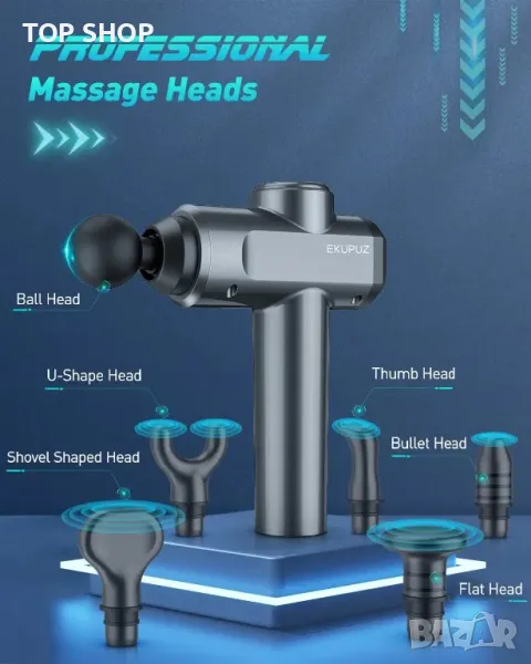 ОПИСАНИЕ - Масажиращ пистолет за дълбоки тъкани: Масажният пистолет EKUPUZ позволява ефективна мускулна релаксация и възстановяване. Целевият ударен масаж стимулира притока на кръв и облекчава мускулното напрежение. Подходящо за пациенти с болки в раменете и шията, фитнес ентусиасти, заседнали работници, домакини и работници на открито